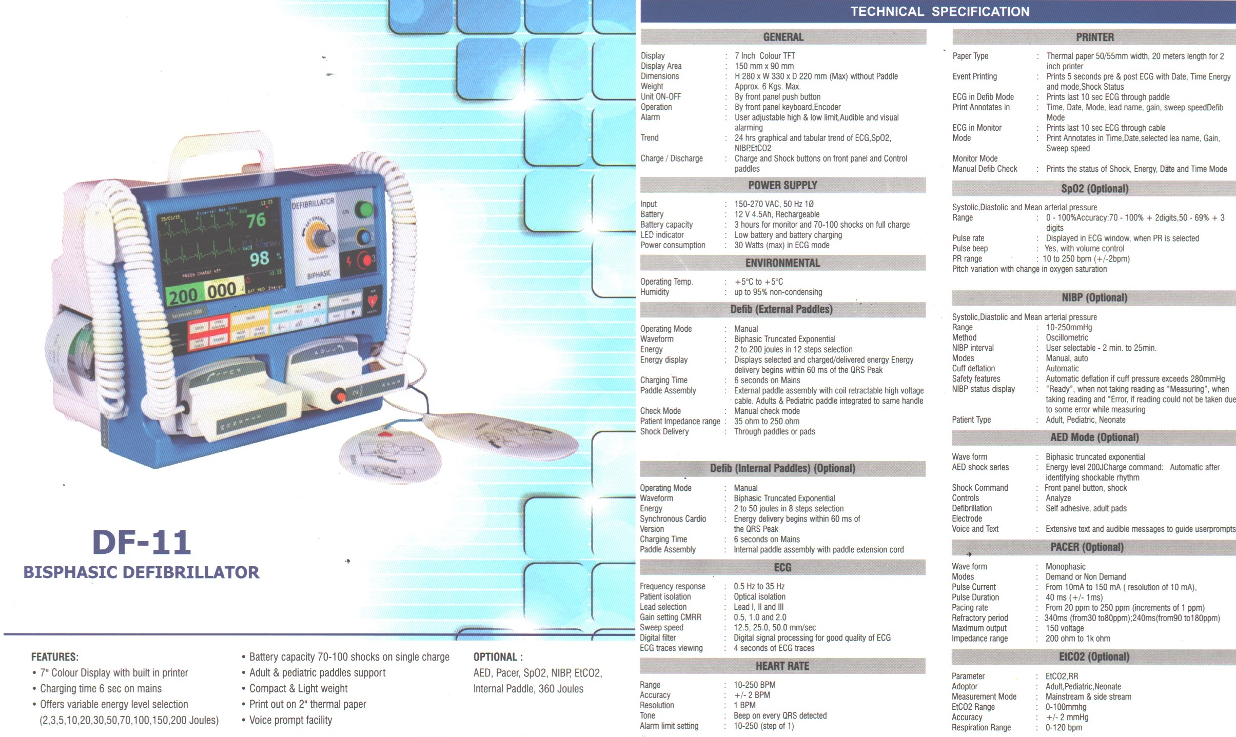 AED, pacer,spo2, NIBP , ETCO2, INTERNAL PADDLE, 360 JOULES