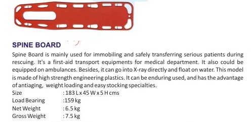 Spine board is mainly used for immobiling and safety transferring serious patients during rescuing . it s a first aid transport equipment for medical department . IT also could be rescuing. It’s a first -aid transport equipment’s for medical department.it also could be equipped on ambulances. besides , it can go into x-ray directly and float on water. this model is made of high strength engineering plastics.it can be enduring used, and has the advantages of antiaging, weight loading and easy stocking specialties.