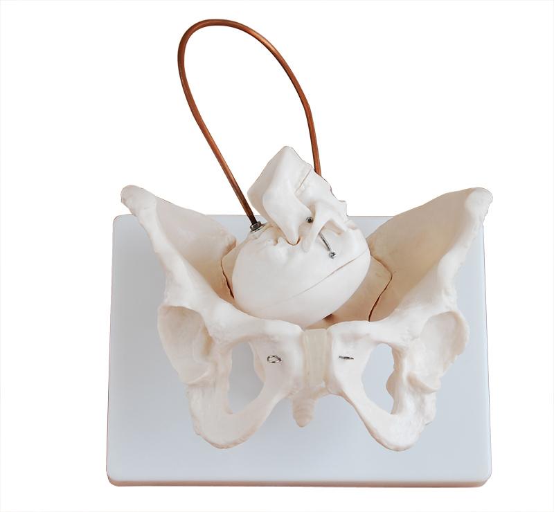 This model consist of 2 innominate bones, sacrum, coccyx, with fatal skull which is firmly connected with the model by means of a flexible metal tube which can be fixed in any position.