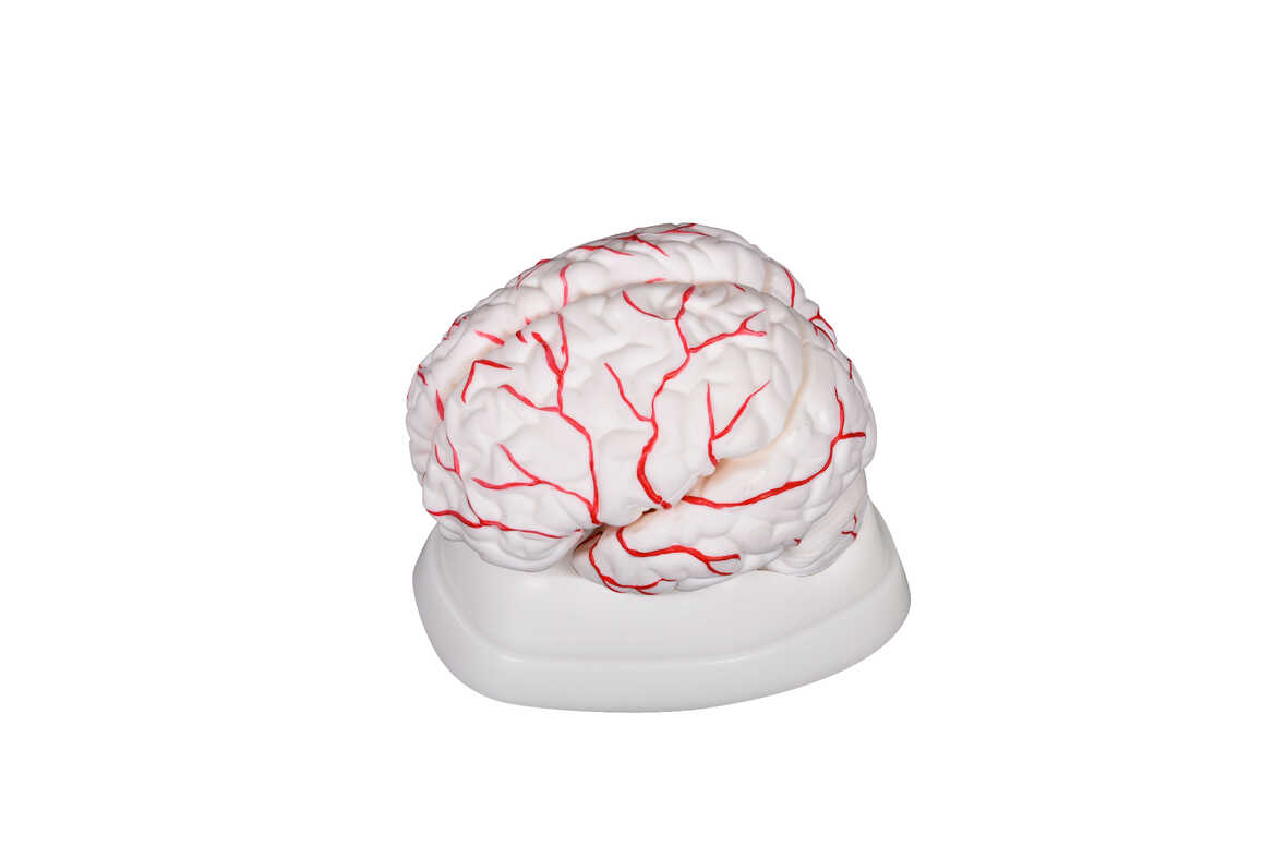 Demonstrate external features of human brain and its arterial supply as a whole, as well as the relations between their component portions. External features of the brain: cerebral hemisphere, brain stem, cerebellum.The arterial supply of the brain: sources, vertebral, internal carotid arteries, arteria supply of the cerebellum and cerebrum. Dissectible into 8 parts. On stand.